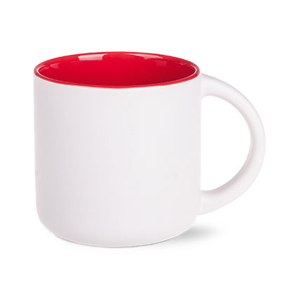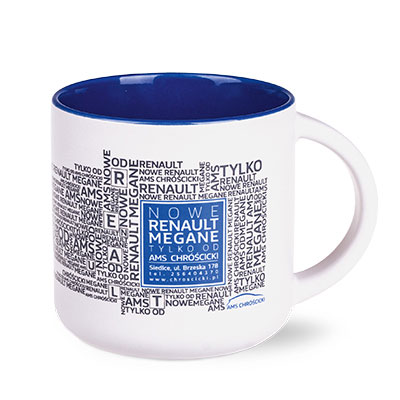 Kubek reklamowy z białym, matowym szkliwem na zewnątrz i kolorowym, błyszczącym wnętrzem. Proste, cylindryczne ścianki umożliwiają nanoszenie bardzo dużych i rozbudowanych nadruków reklamowych. Cechą charakterystyczną tego fasonu jest niepowtarzalny kształt uchwytu. Kubek o bardzo dużej pojemności.