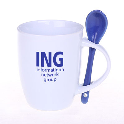 Kubek reklamowy z kolorowym wnętrzem i białym szkliwem na zewnątrz. W zestawie ceramiczna łyżeczka. Unikatowy kształt uchwytu ułatwia przechowywanie łyżeczki. Produkt jest końcówką serii, mogą na nim występować nakłucia, kropki oraz różnice w odcieniu szkliwa.